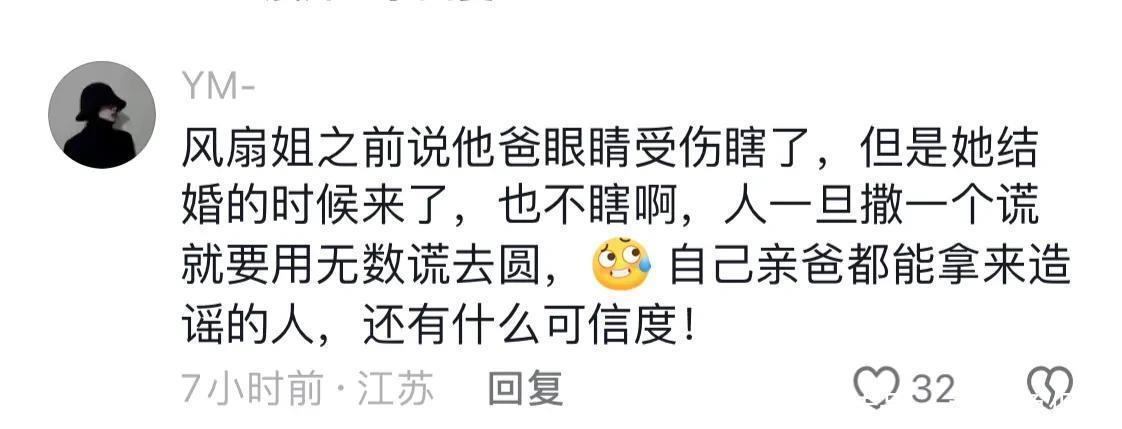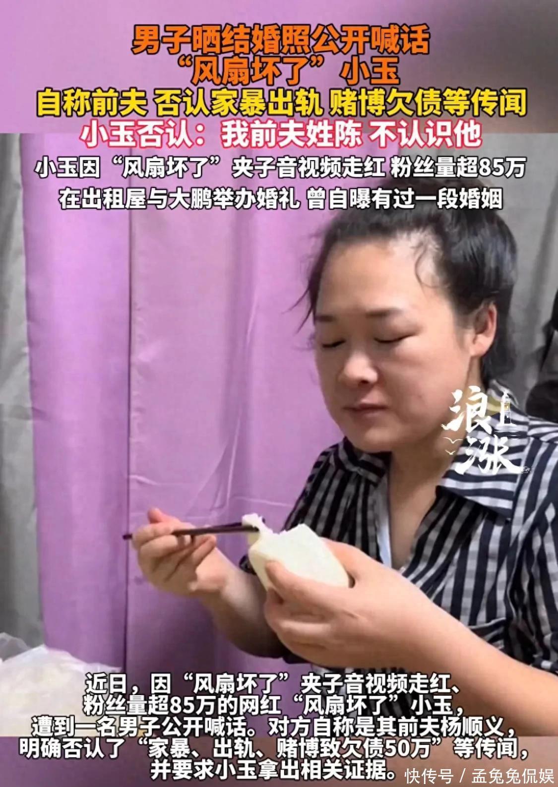这就奇怪了,她不认识杨顺义,可人家明明拿出了结婚照和婚礼视频,这应该不会有假吧?此前小玉自曝有过一段婚姻,那现在一个自称前夫的杨顺义,还有姓陈的前夫,岂不是有两段婚姻?真是一出好戏啊,现在双方是各执一词,究竟谁说的才是真的,相信很快就会有答案了,让我们拭目以待吧!如果杨顺义说的是真的,那么“风扇姐”在网络上的人设必将崩塌,以后再想吃互联网这碗饭估计就难了。让我们来看看网友们怎么说:“风扇姐之前说他爸眼睛受伤瞎了,但是她结婚的时候来了也不瞎啊,人一旦撒慌就要用无数谎言去圆。”