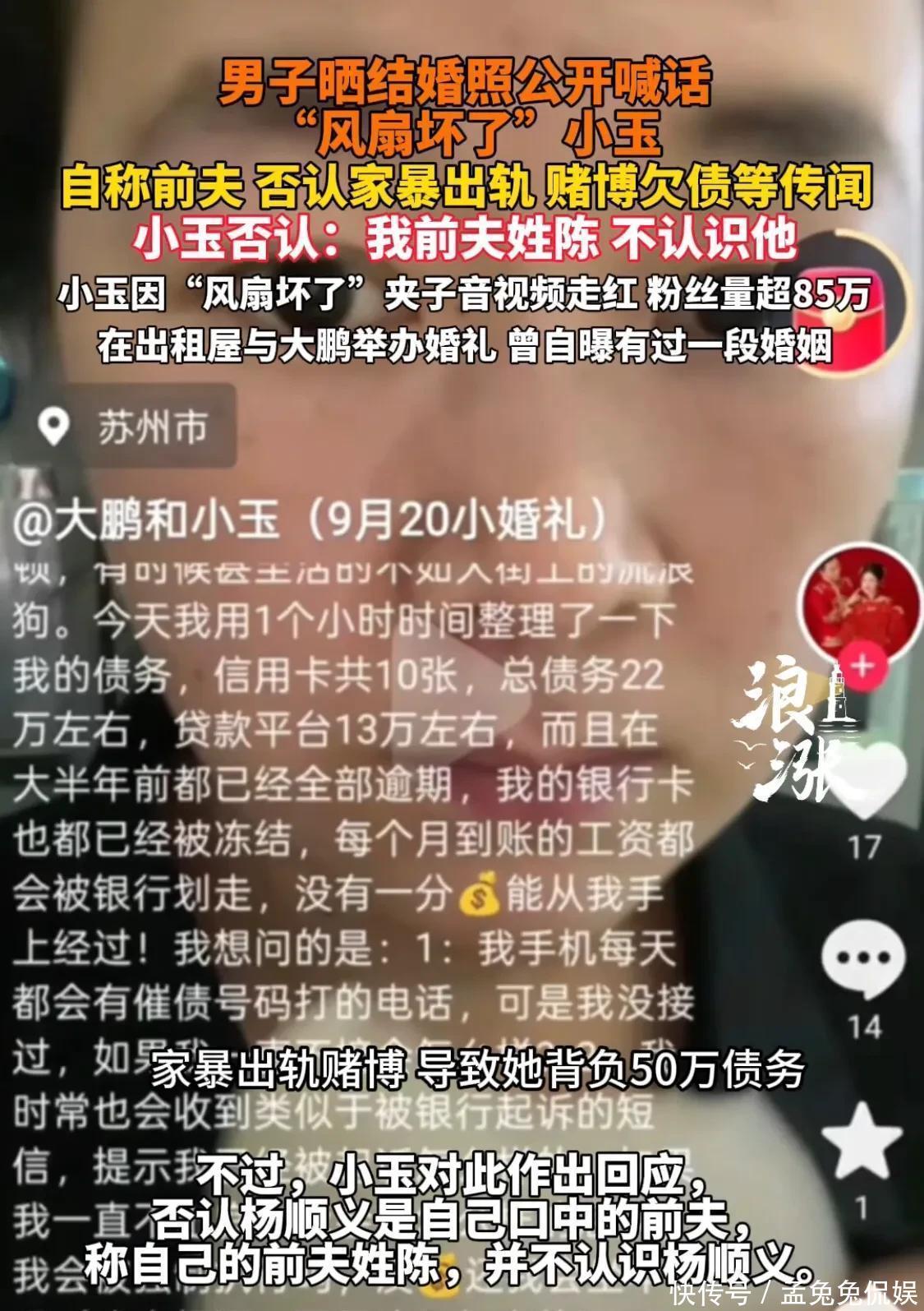 10月18日,杨顺义再发视频表示:自己一直是一个真诚老实的人,却被小玉这样污蔑诋毁,这才忍无可忍出来发声,也准备将所有的真相公之于众,让大家看清楚小玉的真面目。图片哦豁,这回真是有好戏看了,究竟是小玉真的有过那么一段不堪回首的婚姻经历?还是她在通过贬低前夫衬托自己?对于杨顺义的爆料,小玉作出了回应:杨顺义不是我口中的前夫,自己前夫姓陈,不认识杨顺义。
